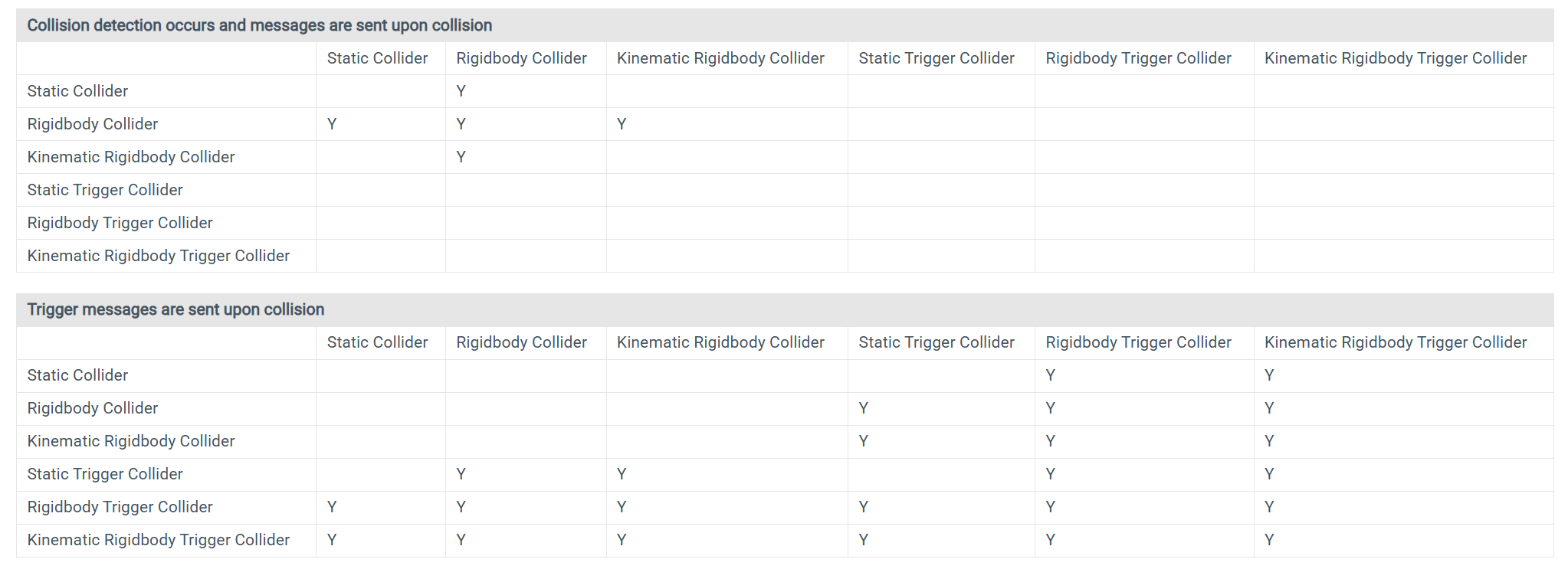 + 추가로 Kinematic은 RigidBody 컴포넌트의 설정 중 하나로, 이 옵션이 활성화되면 해당 오브젝트는 물리 엔진의 힘(중력, 충돌, 외부 힘 등)에 영향을 받지 않는다. Collider의 Trigger, RigidBody의 Kinematic 옵션의 관계를 이해하여 물리 연산을 최적화 해야한다. 이벤트 발생요건에 대해선 위의 이미지를 참고하자.