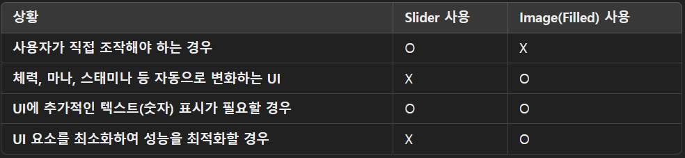 자동으로 변하는 UI(예: 체력바, 경험치 바 등) → Image(Filled)가 더 적합